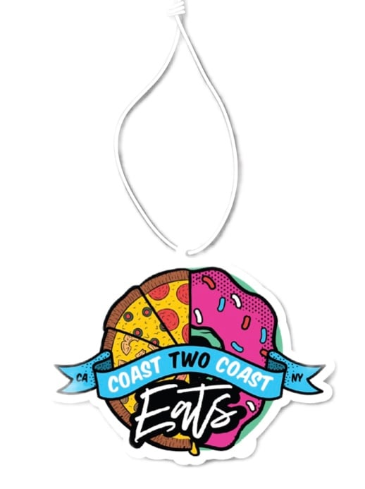Want your car or office smellin' like a snack? Then you need this watermelon scented, Coast Two Coast Eats logo air freshener in your life! Double-sided design, white string, and comes in its own poly bag.